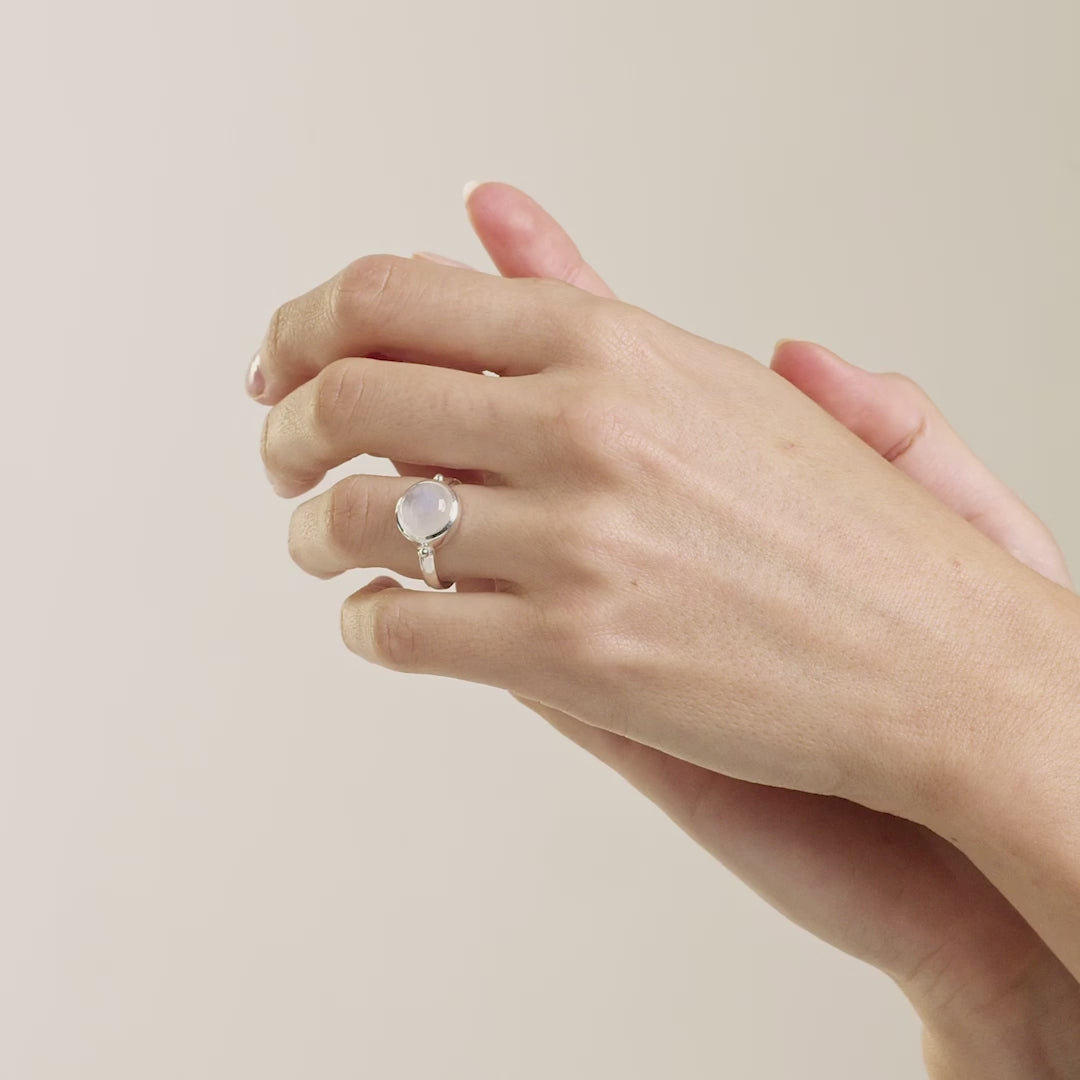 The Garland Silver Moonstone Ring harmonic fusion of beauty and symbolism is positively empowering. Representing new beginnings, rainbow moonstone is said to help you connect with the divine feminine within yourself and access your intuition. Our skilled jewellers set the ethereal, responsibly sourced moonstone cabochon in a strikingly simple sterling silver bezel on a high-polished, half-round band. The result is timelessly feminine.