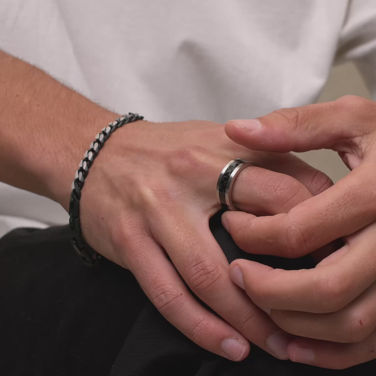 The rectangular Aviator Ring fuses the rugged durability of brushed stainless steel with the lightweight strength of carbon fibre, a high-performance futuristic material found in modern aeroplanes and spacecraft. The ring’s two-tone aesthetic makes a statement in utilitarian sophistication—a nod to the spirit of the aviator who values precision engineering and streamlined design.